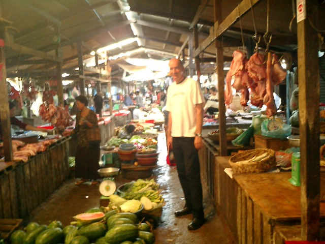 At a market place. The meat can hang conveniently in the heat of 35 degrees Celsius. It smelled a bit there ... but lets not be insipid !
