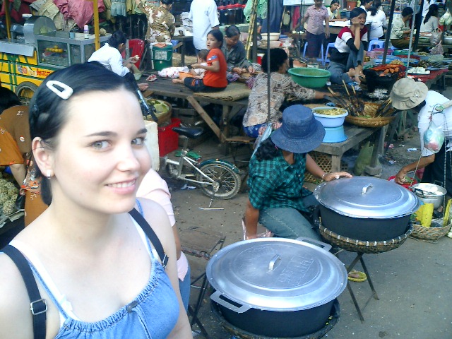 Madelina in front of a restaurant. The two big casserols in the front are for take away meals, sold indipenadntly, and the woman with the beige cap ... is an other walking restaurant !